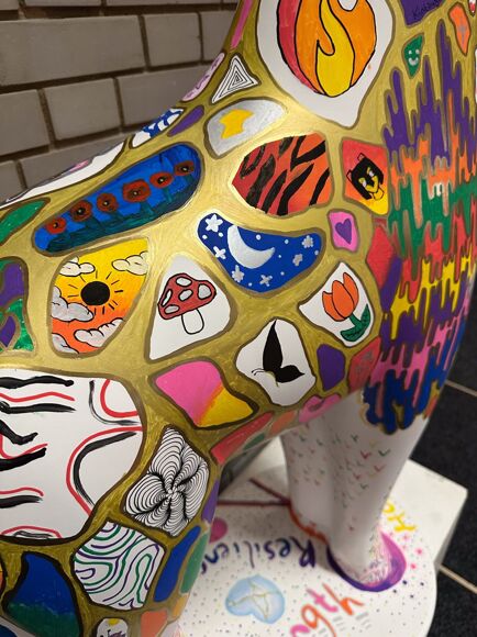 Over 50 of our pupils worked together decorating a Mini G who they named Gideon, meaning 'great warrior.' Members of the Wellbeing Art Club and those taking part in the art community project as part of their Duke Of Edinburgh Award, examined ‘GoGo Safari’s’ theme of ‘strength, resilience and hope’. They came up with the brilliant idea of expressing this through the Japanese Art form 'Kintsugi' (to repair with gold), as it represents the journey of healing and becoming stronger. Decorative images and colours symbolic of inner strength were then painted onto Gideon.